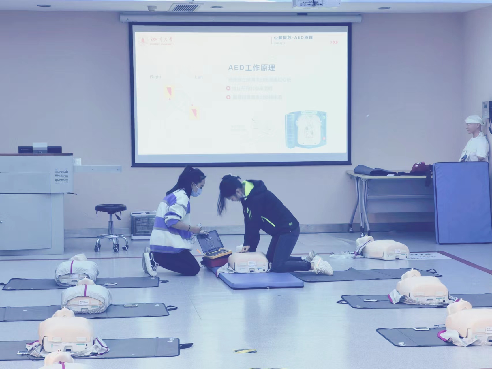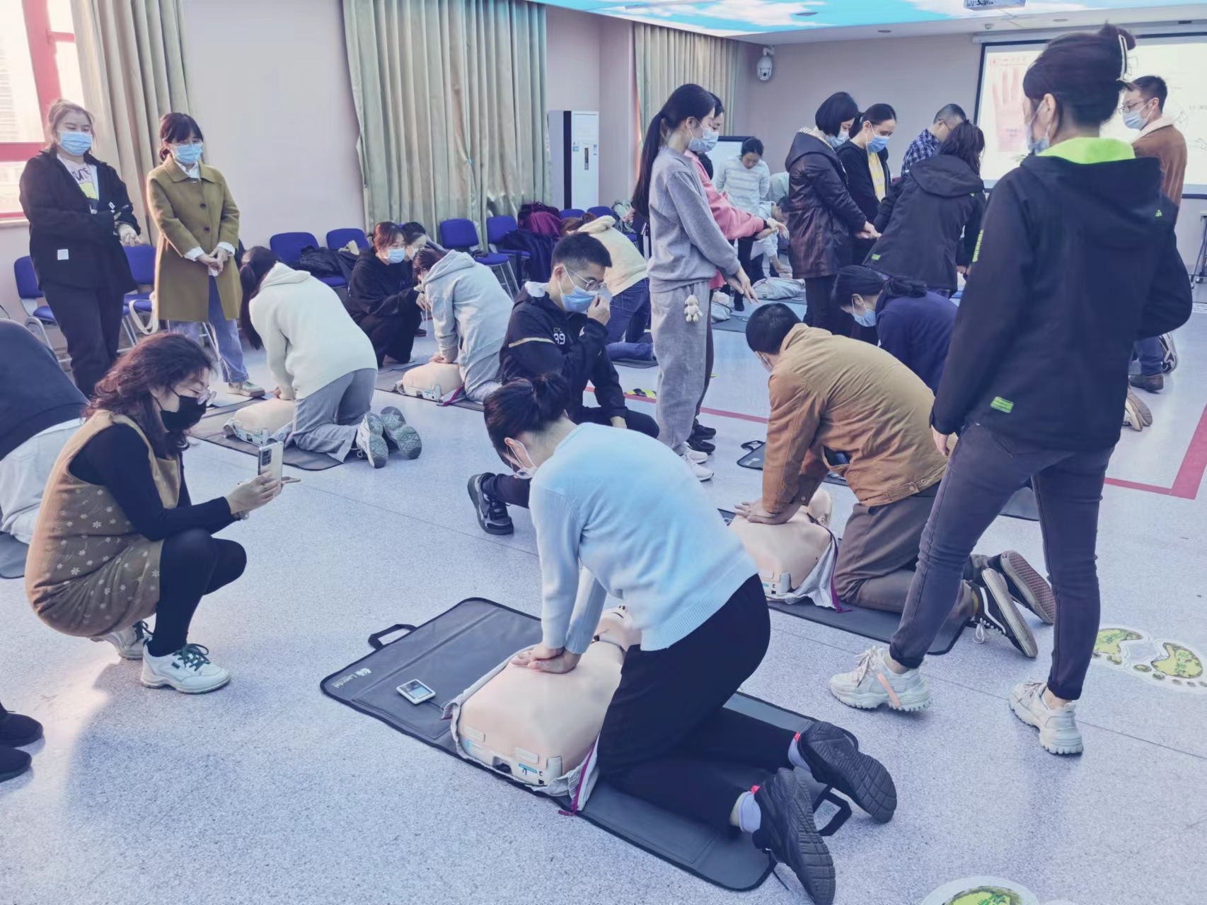 参训师生在中心授课老师的讲解和指导下,学习了心肺复苏、AED设备使用等基本知识,进行了实际操练,通过了心肺复苏操作考核。
