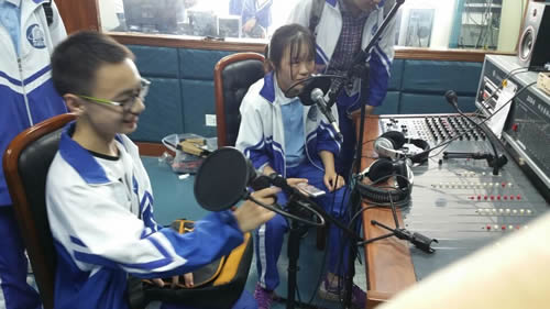 外国语学院语音实验室崔弘扬老师、江安校区辅导员田旭雯、何功明老师和同学们热情地接待了来访师生。首先,外国语学院2015级辅导员田旭雯老师简要介绍外国语学院的专业设置和概况,使来参观的同学们对外国语学院各专业的师资力量以及学习情况有了更深入的了解。紧接着,语音实验室崔弘扬老师对语音实验室所配备的资源进行讲解,调动了同学们参观的积极性和参与的热情。在外国语学院两个年级的志愿者同学们的领导下,北师大成都实验中学初2013级的同学们有序地进入各个语音实验室进行参观。他们近距离地接触了语音实验室中的外文电视台、电台直播室以及日常语音上课教室等。同学们还在老师的帮助下用语音实验室的设备录制了自己原创的直播节目。