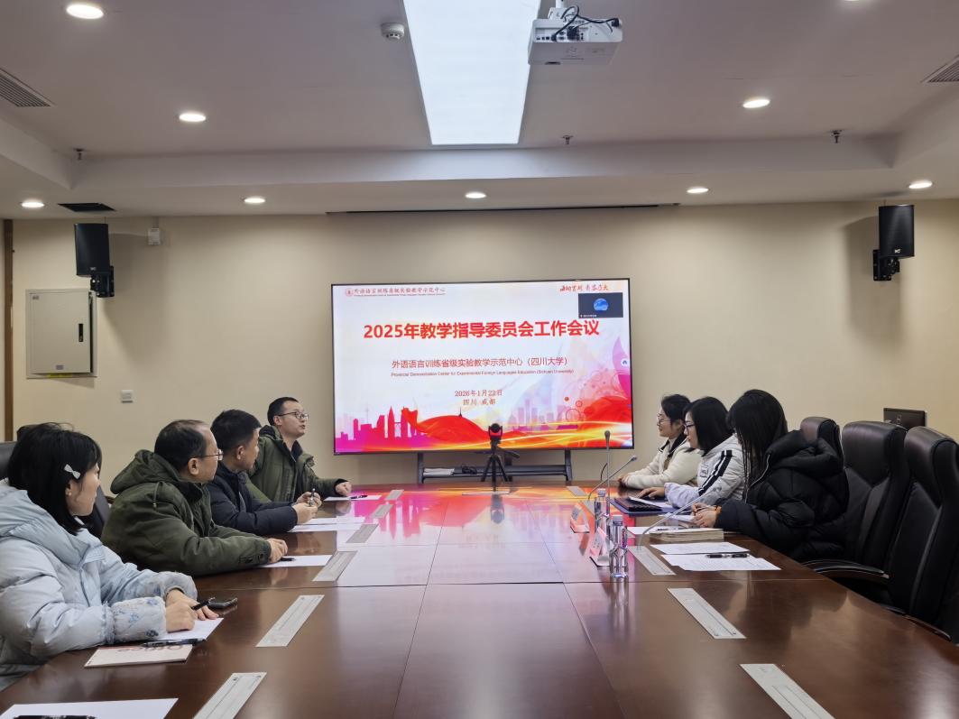 2026年1月22日,外语语言训练省级实验教学示范中心(四川大学)2025年教学指导委员会工作会议在四川大学江安校区文科楼四区407顺利召开。中心教学指导委员会主任文旭教授,委员王欣教授、许德金教授、罗良功教授、胡杰辉教授、吕光宏教授、方小莉教授,学校实验室及设备管理处老师以及示范中心实验技术教师等线上线下参加了会议。本次会议审议了示范中心2025年工作报告,聚焦AI技术在外语教学中的深度应用以及高质量复合型外语人才培养机制等核心内容。